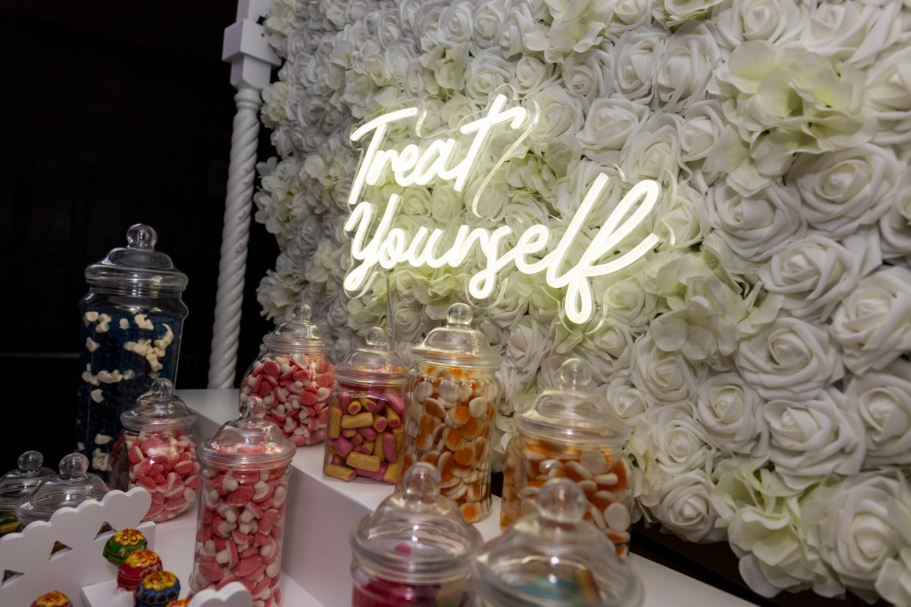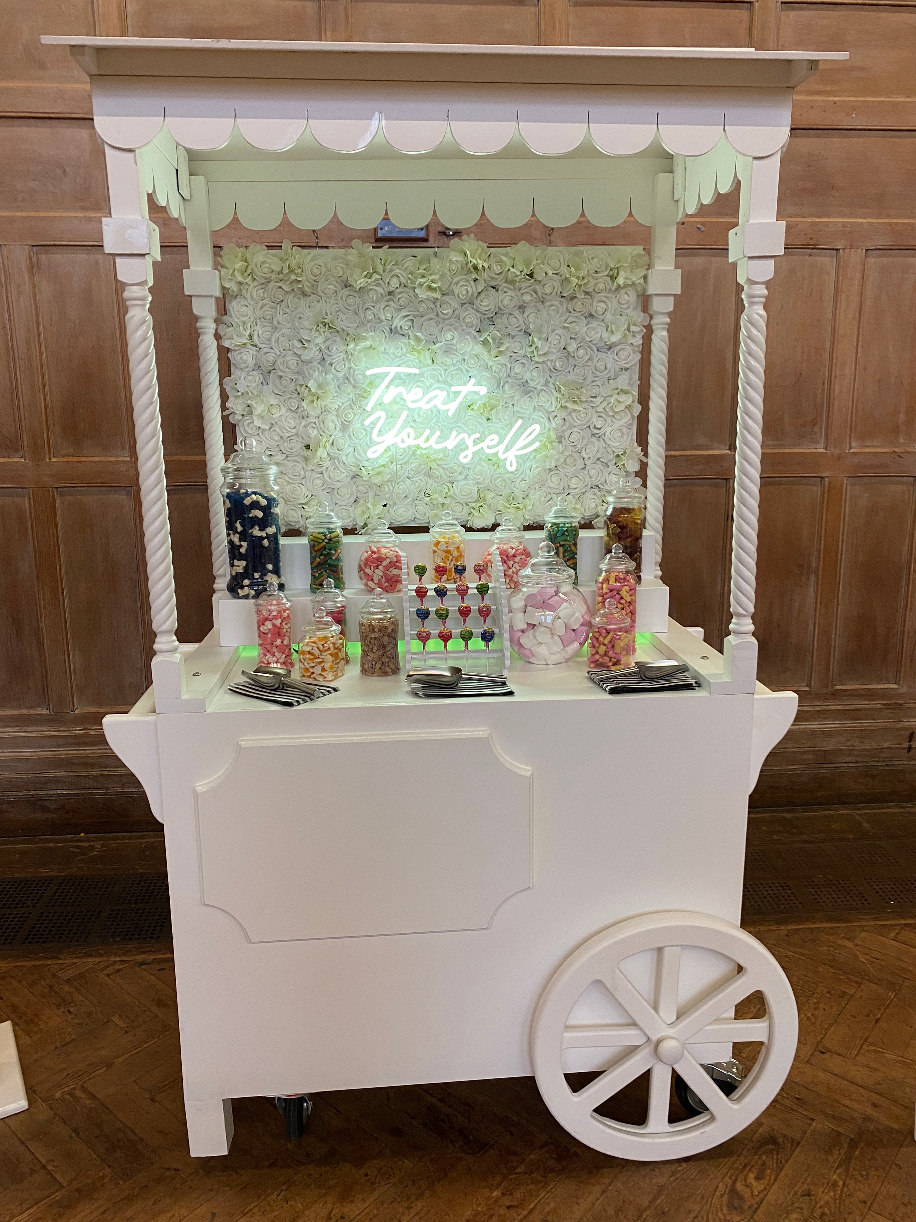 Treat yourself and your guests to our Luxury Sweet Cart, complete with a floral backdrop and LED sign. Choose from a variety of sweets, perfect for weddings, parties, and celebrations!